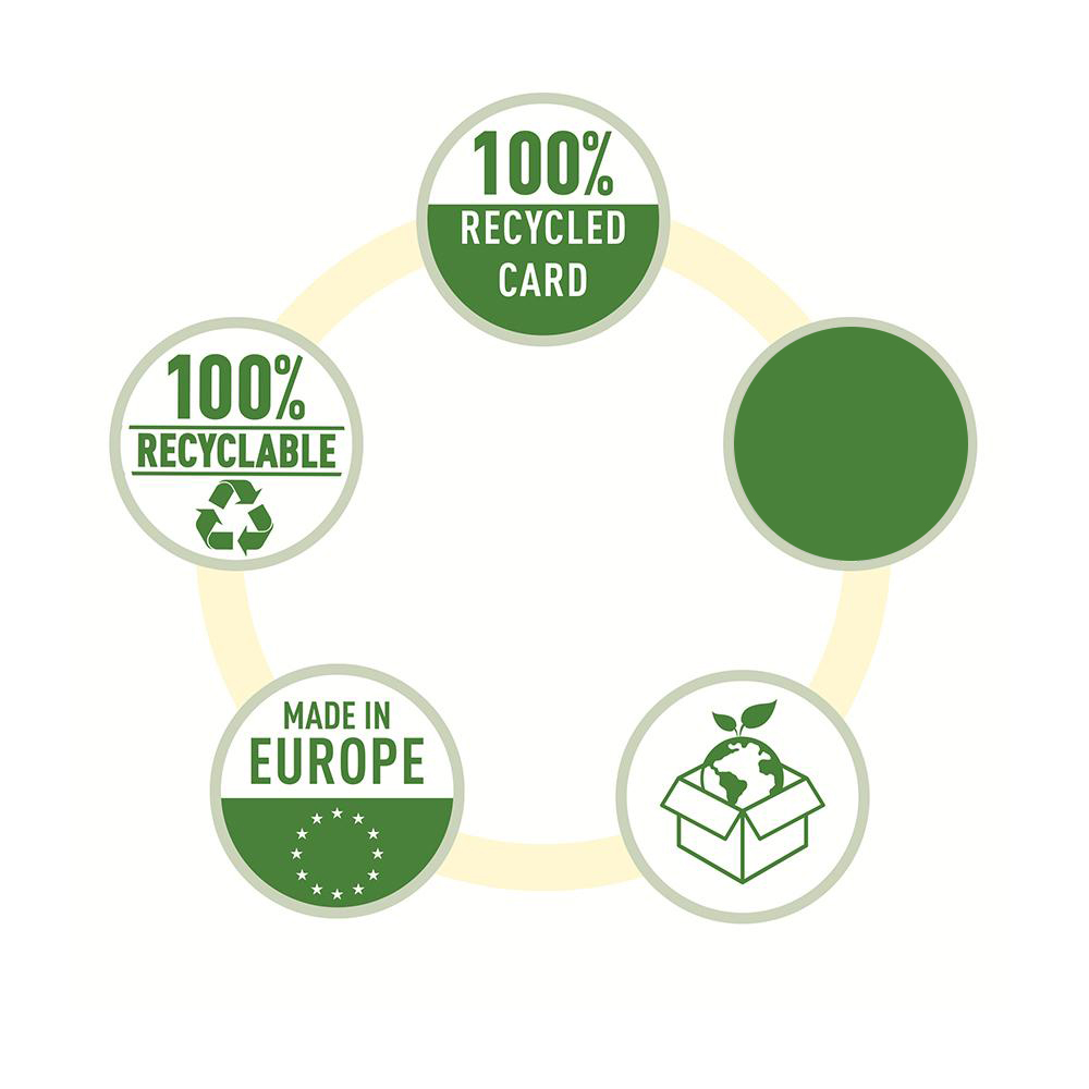» Impact neutru, carton 100% reciclat, reciclabil 100%, certificat Blue Angel si FSC privind mediul inconjurator