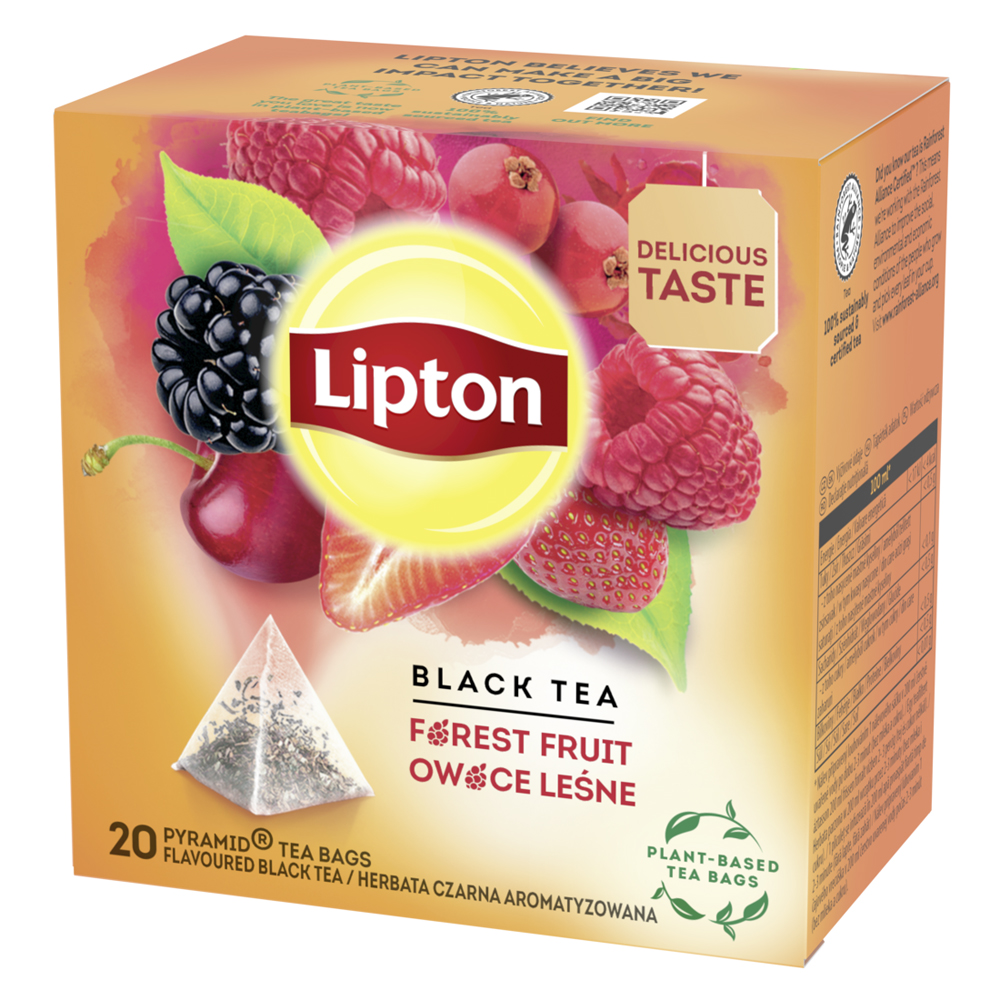 Ceaiul Lipton Forest Fruit este ceaiul negru de cea mai inalta calitate cu bucati de zmeura, mure si capsuni. Fructele confera ceaiului o aroma de vara. Ceaiul este pastrat in pliculete tip piramide care va permit sa preparati o bautura puternica si extrem de aromata.