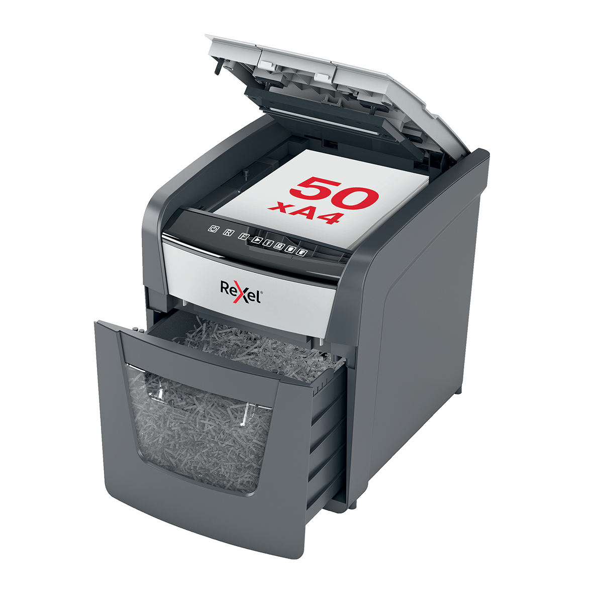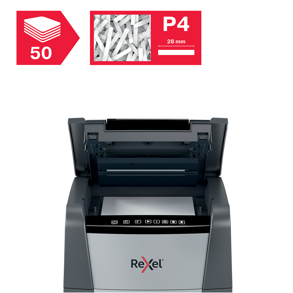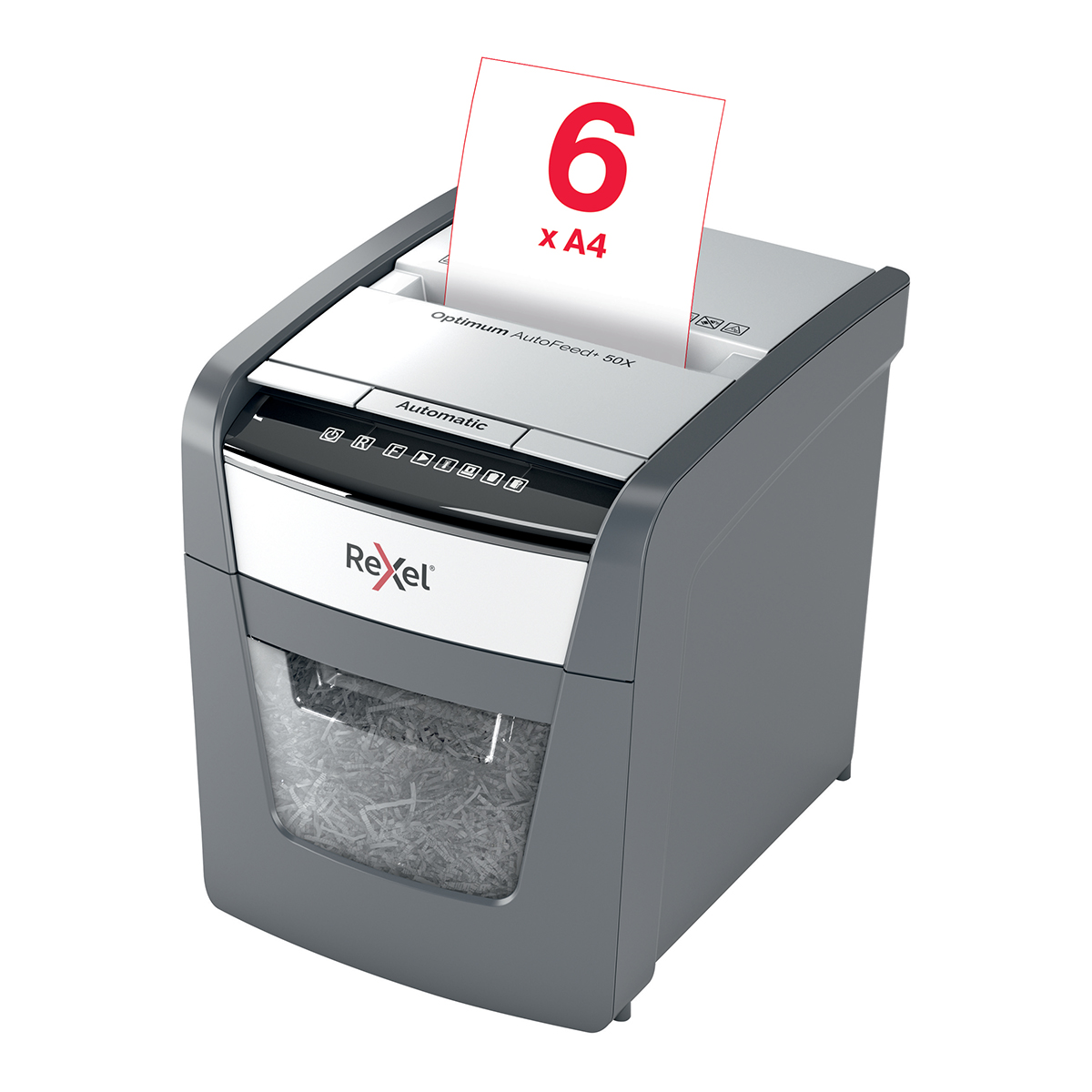 Distrugatorul automat pentru documente Rexel Optimum AutoFeed+ 50X distruge automat 50 coli A4 (80 gsm) dintr-o singura incarcare, in bucati de 4x28mm (P-4, cross cut). Acest distrugator automat pentru documente este ideal pentru biroul de acasa si pentru acasa in general, datorita faptului ca are un cos compact de 20 L. Nu mai este nevoie sa introduci hartia manual si nici sa separi agrafele de hartie sau sa scoti capsele, Rexel Optimum AutoFeed 50X face toata treaba in locul tau.