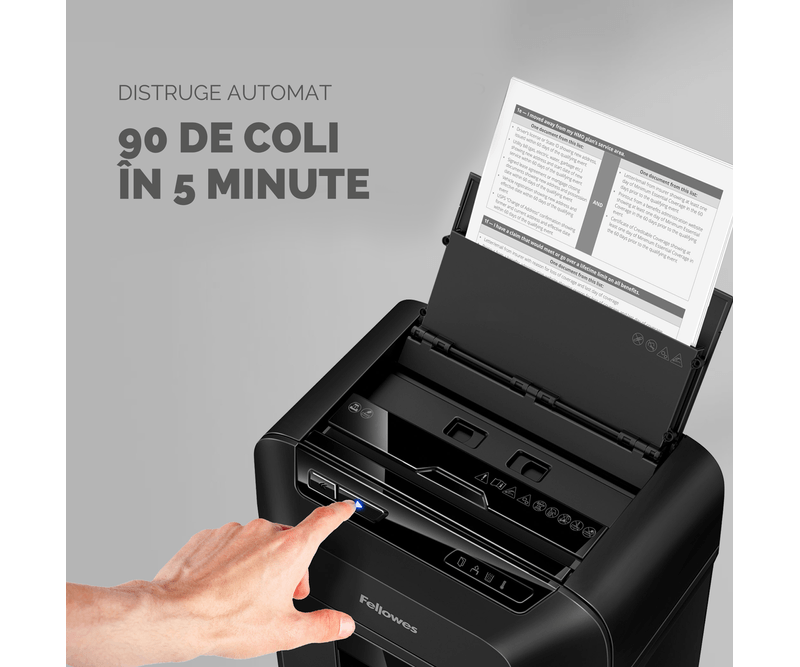 Cautati un distrugator care sa functioneze automat? Alegeti din oferta noastra un model FELLOWES AutoMax 90M! Este potrivit pentru distrugerea documentelor din hartie, chiar si capsata sau cu agrafe si a cardurilor de credit. Poate distruge in mod automat 90 de coli si 9 coli in mod manual, cu o viteza de 3 m pe minut.