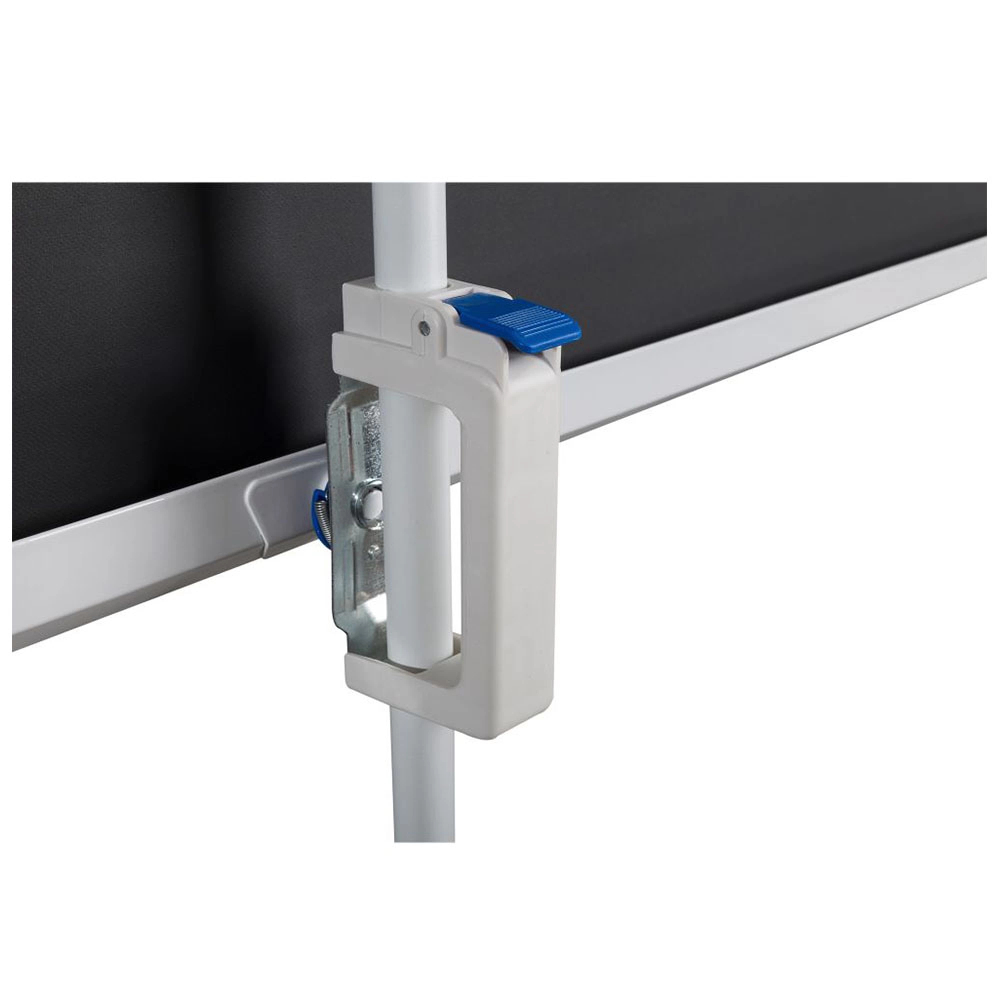 Suprafata ecranului este este din material textil alb, mat, ce poate fi curatat usor. Are o bordura neagra pe toate laturile, cu o latime variabila, ce confera un excelent contrast cu imaginea proiectata. Montarea pe trepied confera mobilitate, pentru a putea fi transportat oriunde aveti nevoie. Ecranul are o diagonala de 112 cm si un unghi de vizibilitate de 160 de grade.