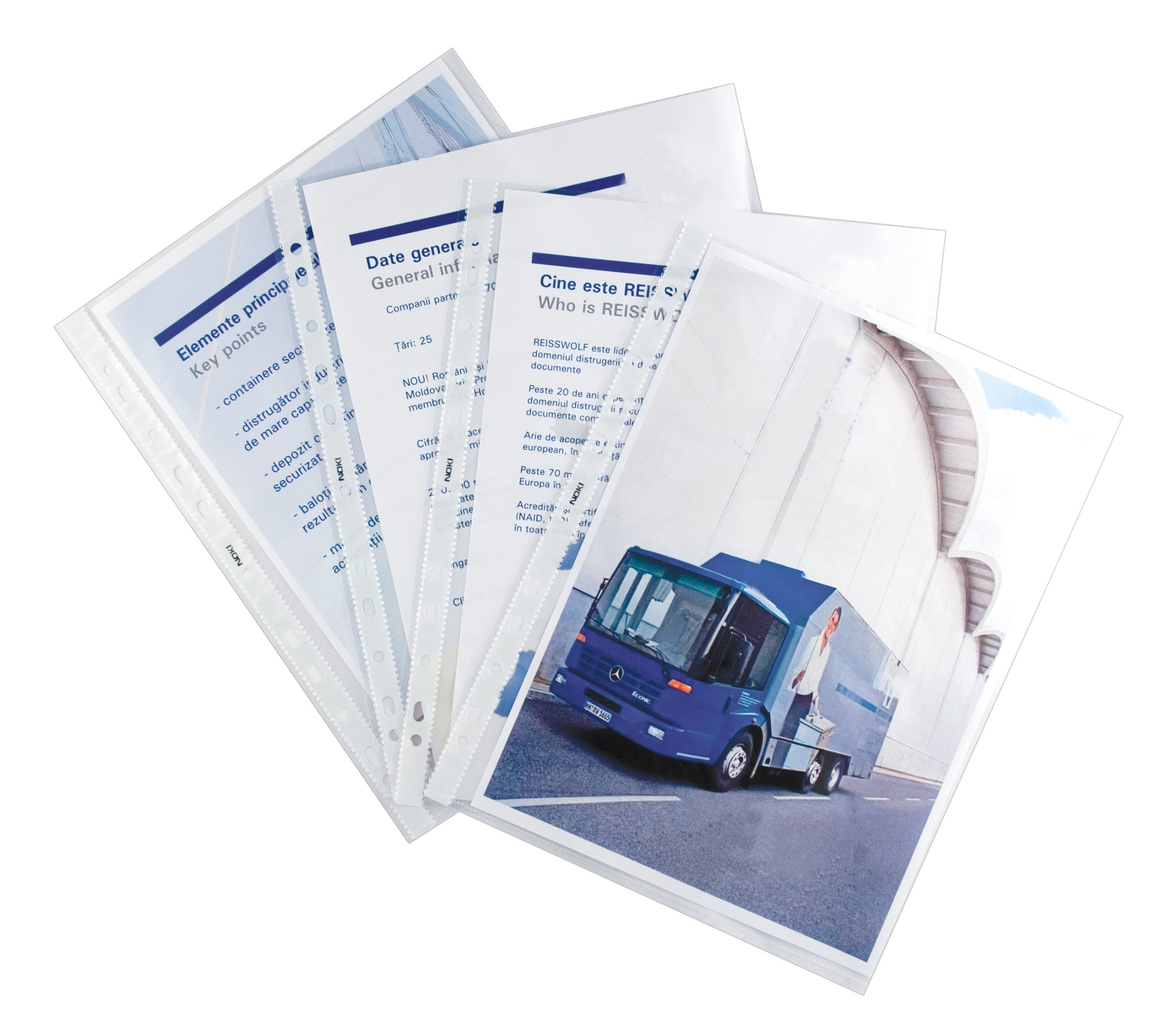 File fabricate din polipropilena tip cristal, cu perforatii standard pentru indosariere. Format: A4 portrait, cu deschidere in partea superioara, grosime 45 microni, 100 bucati/set.