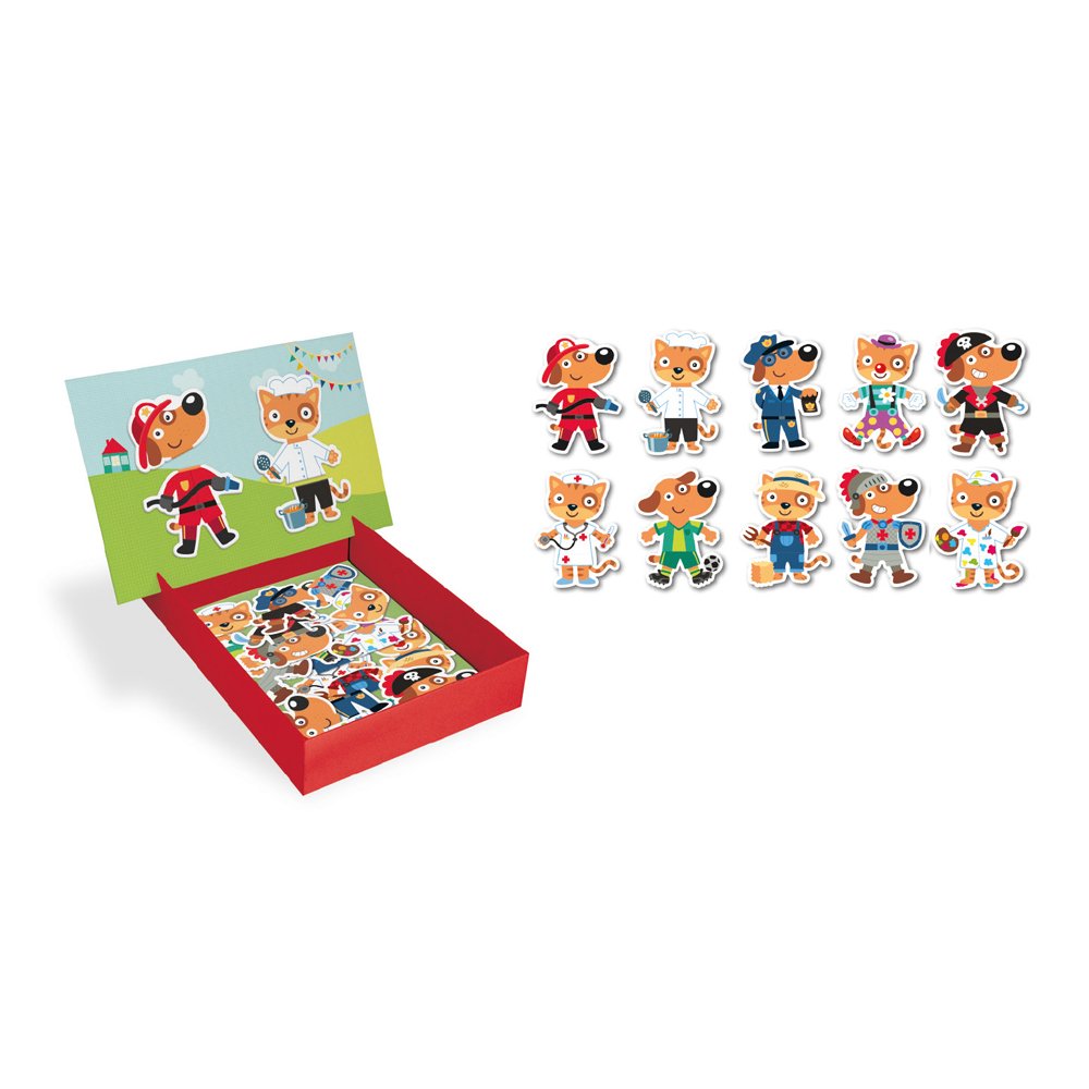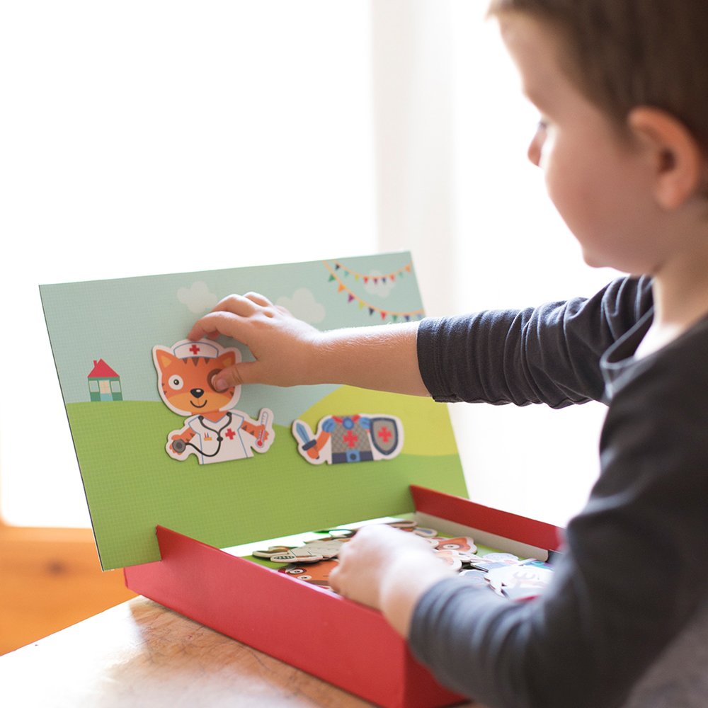 Joc magnetic, model Dress up, pentru a asocia partile diferitelor personaje si a invata profesiile. Descoperiti profesia fiecarui personaj sau creati compozitii infinite noi! Fiecare joc con?ine: 1 scena magnetica de 28 x 18 cm pentru a se potrivi pe baza cutiei si 30 de magneti pentru a crea diferite personaje. Un design exclusiv APLI Kids cu ilustratii originale si colorate. Valoare didactica ridicata: incurajeaza observarea si imaginatia; creste concentrarea si atentia, generand interes pentru obiecte, animale ?i personaje pe care nu le cunosc. Recomandat copiilor cu varsta de cel pu?in 3 ani.