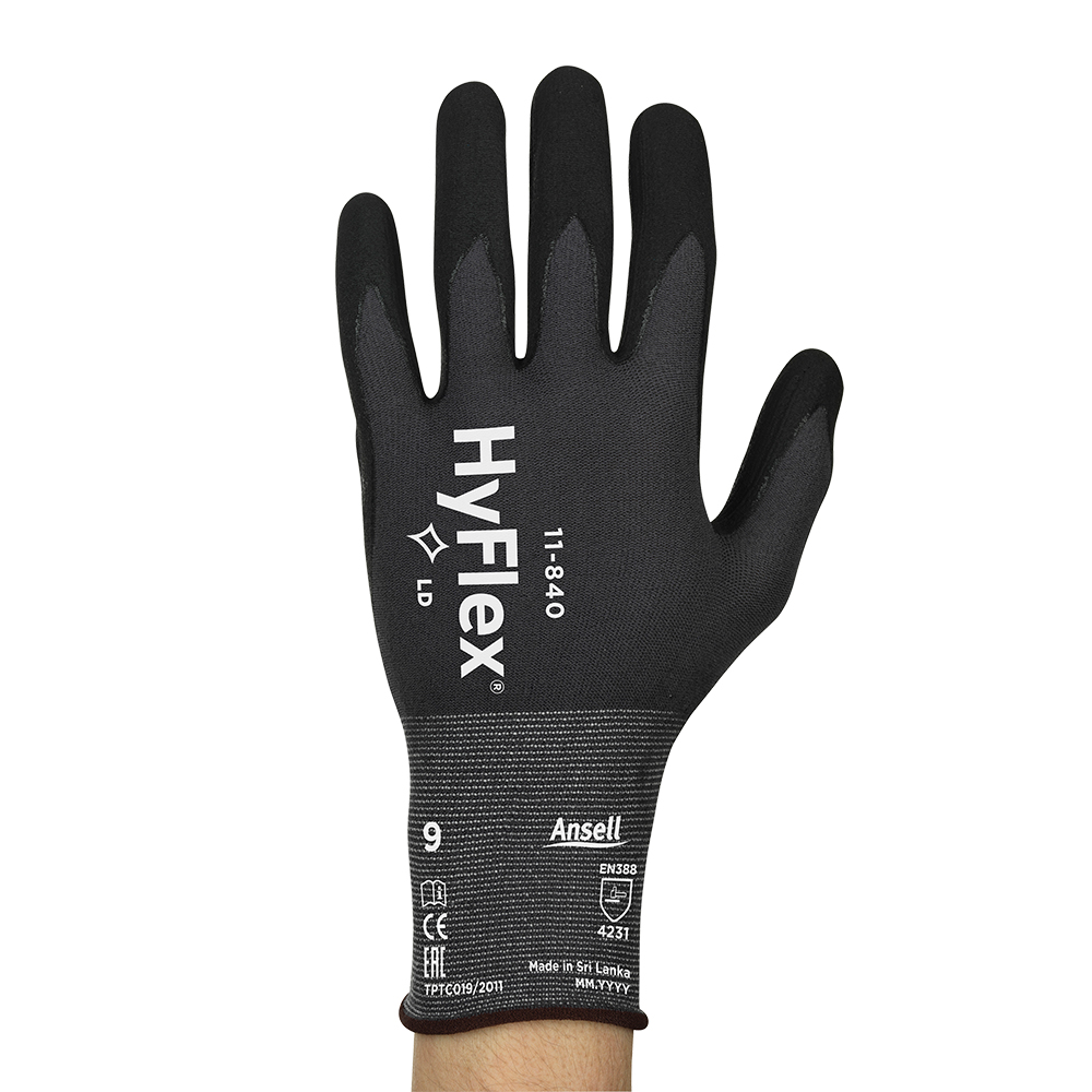 Manusile HyFlex 11-840 ofera o protectie ideala pentru o gama de operatiuni de manipulare si asamblare generala. Tehnologia Ansell ZONZ Comfort Fit se potriveste cu conturul natural al mainii pentru sprijin, respirabilitate si arie de miscare imbunatatite. Captuseala fara cusatura din Nylon-spandex cu finetea de 18 are un tuseu de mana neacoperita, oferind respirabilitate, confort si sensibilitate imbunatatita a varfului degetului pentru operatiuni de precizie.