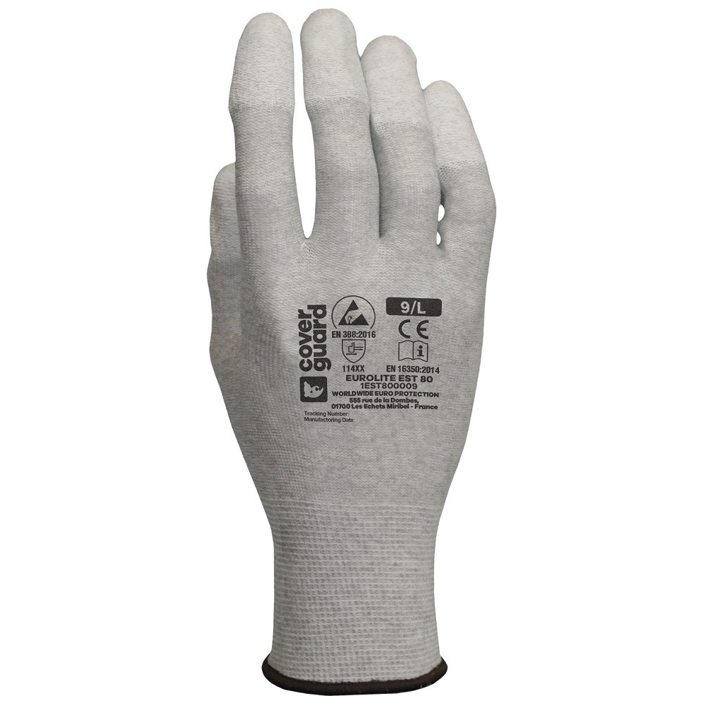 Manusi antistatice cu insertii de fibre carbon in material. Imersie de poliuretan pe degete pentru priza imbunatatita si izolare eficienta.