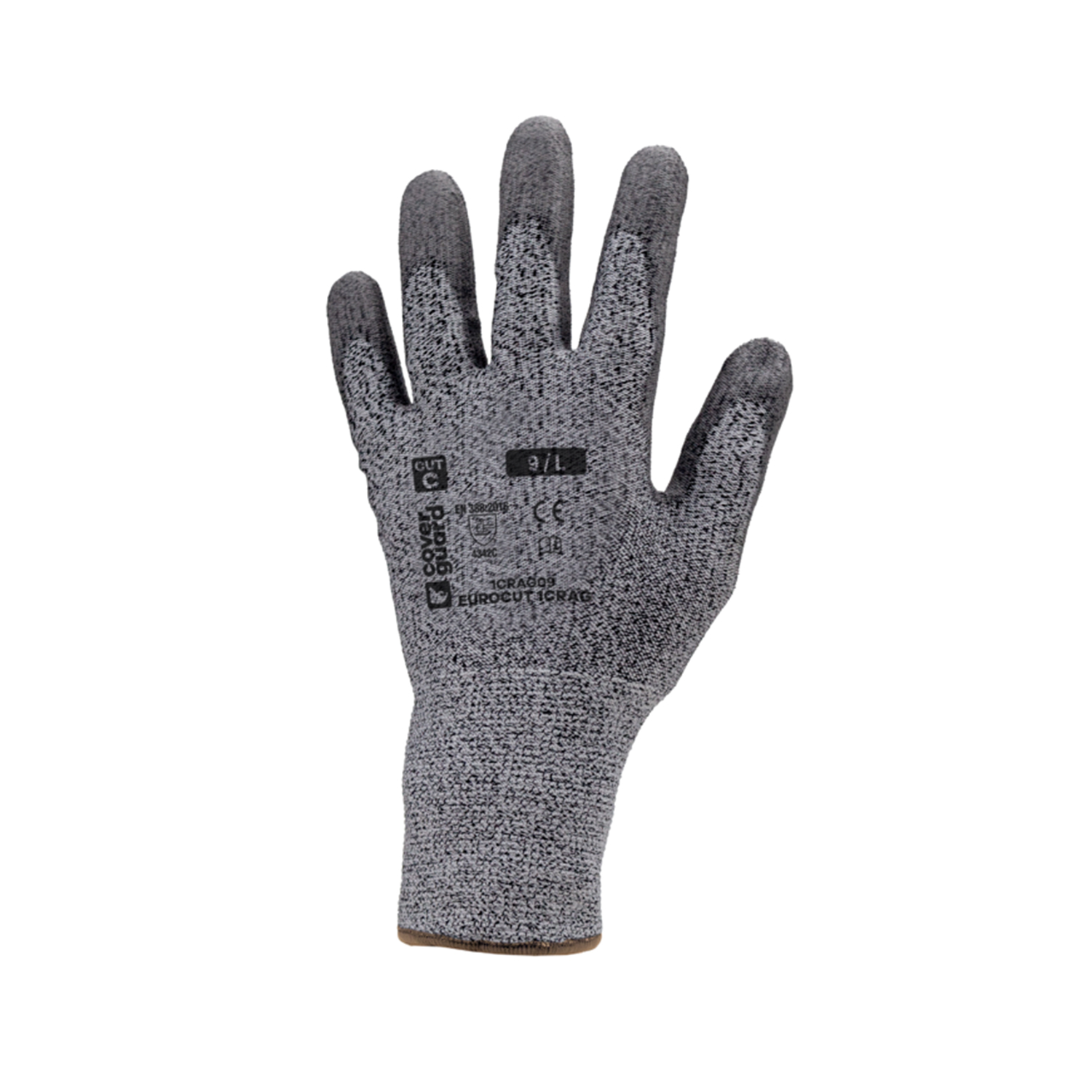 Manusi tricotate din fir 13, ranforsate cu HDPA si elastan, cu palma acoperita in poliuretan gri si manseta elastica tricotata.