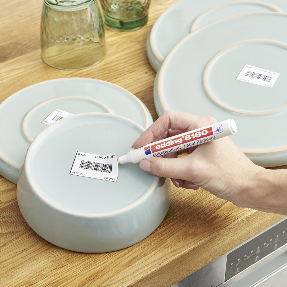 Descopera solutia eficienta pentru indepartarea etichetelor si a reziduurilor de adeziv cu ajutorul markerului edding 8180. Acest marker practic este ideal pentru indepartarea precisa si simpla a majoritatii etichetelor de hartie si a reziduurilor adezive de pe diverse suprafete, cum ar fi parbrizele, talpile pantofilor, sticla si portelanul. Uleiul delicat din compozitie este incolor, cu un miros redus si contine ingrediente naturale, asigurand astfel o utilizare fara picurare chiar si pe suprafetele verticale.