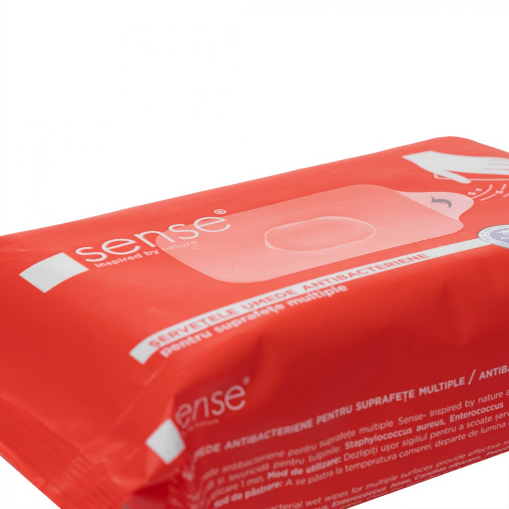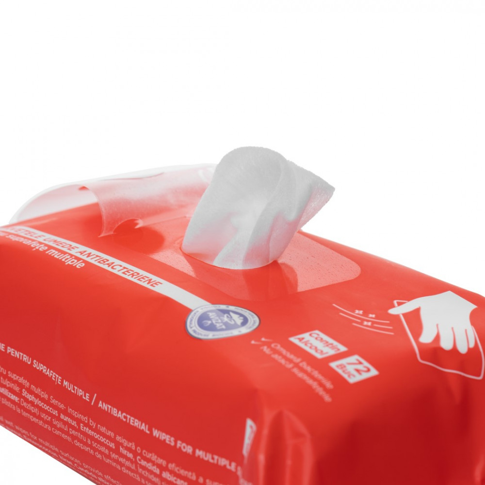 Servetelele umede antibacteriene Sense – Inspired by nature asigura o curatare eficienta a mainilor, oferind prospetime fara a provoca iritatii. Efect cu actiune imediata, in mai putin de 30 de secunde distrugand peste 99% din bacterii. Servetelele sunt imbibate cu substante dezinfectante ce au actiune: bactericida (EN1500:2013). Iritant pentru ochi. Mod de utilizare: Dezlipiti usor sigiliul pentru a scoate servetelul. Inchideti sigiliul dupa fiecare utilizare pentru a pastra nivelul de umiditate. Depozitare: Depoziteaza produsul la temperatura camerei, ferit de razele soarelui si caldura.