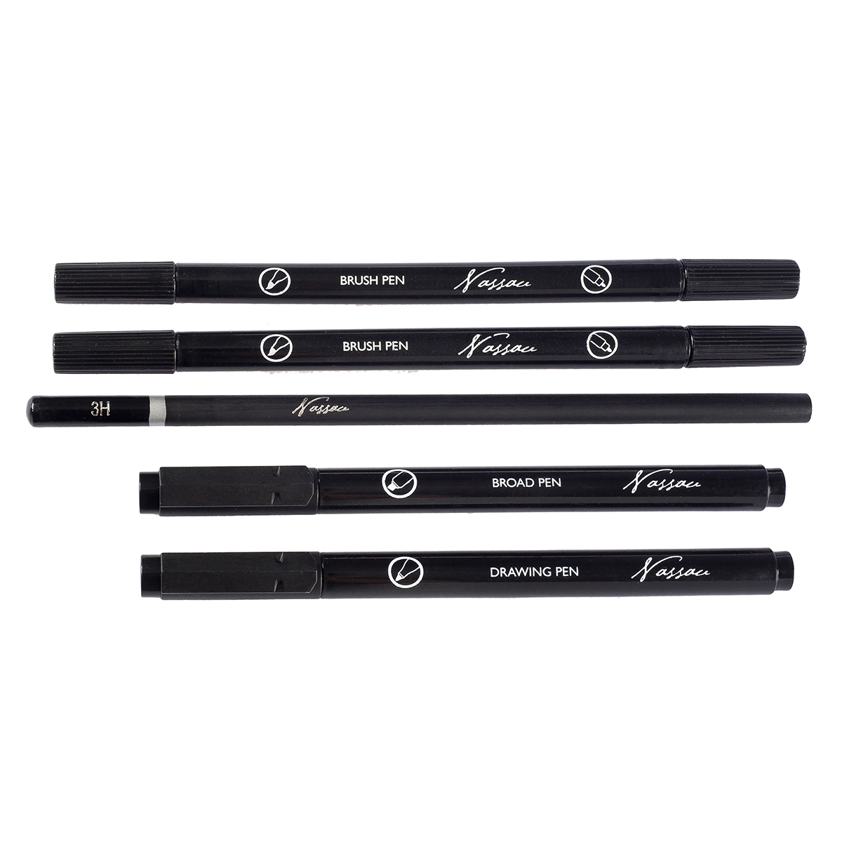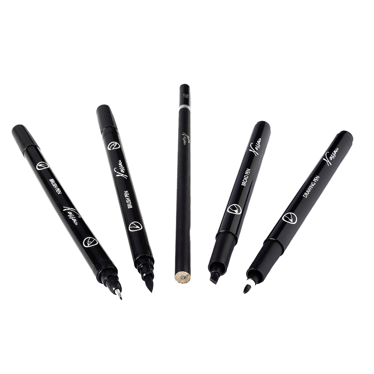 Contine 3 markere (varf tesit 3mm, rotund si tip pensula), un creion (tarie mina 3H) si un liner.