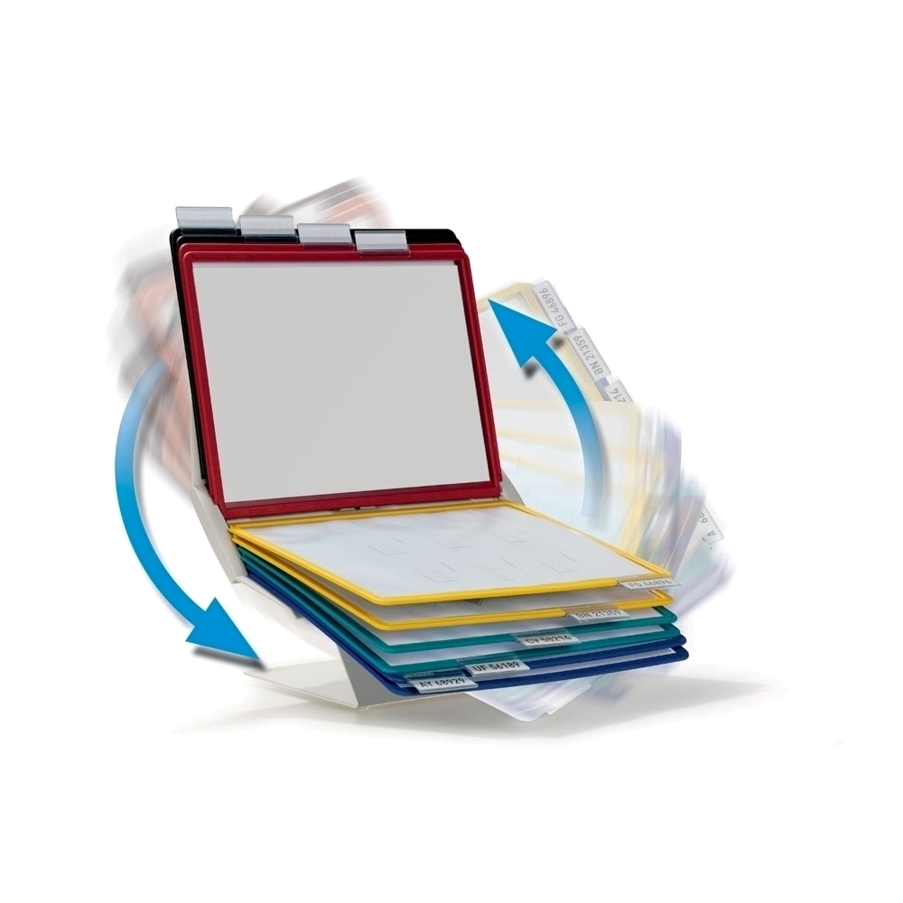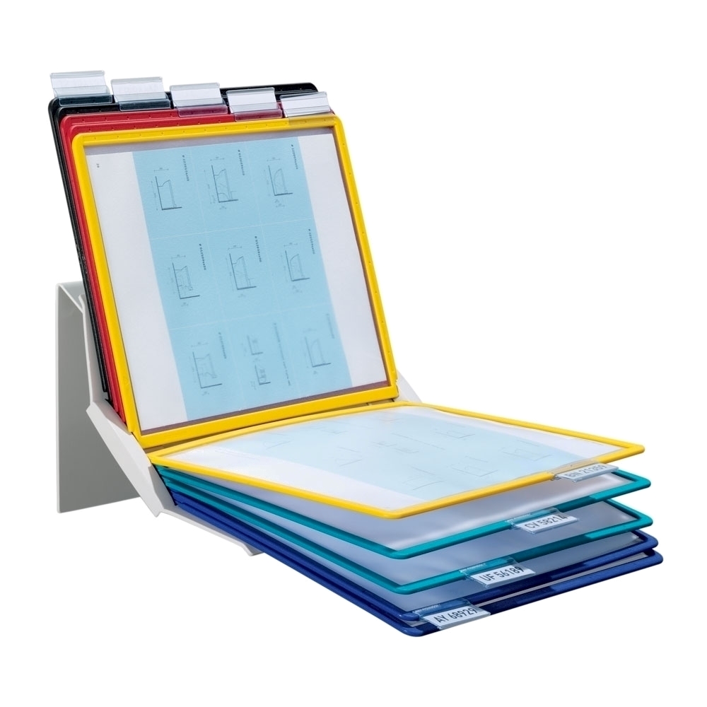 Poate fi folosit ca sistem de prezentare de birou sau de perete, atat In format landscape, cat si portrait. Setul contine: 1 suport pentru display-uri, 10 display-uri, cu cate doua bucati din culorile negru, rosu, galben, verde, albastru si 10 indecsi cu eticheta alba.